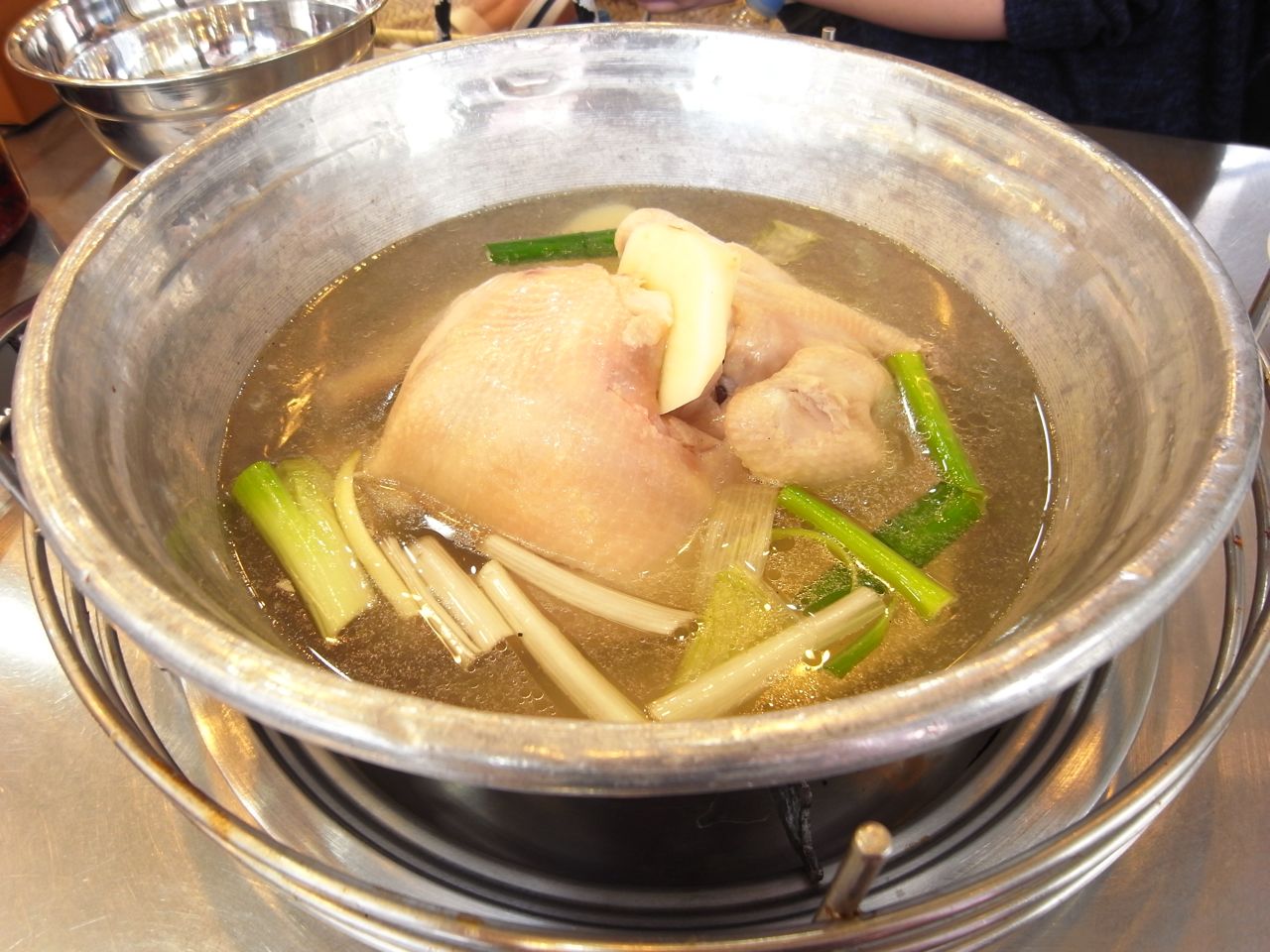 席につくなり、金タライみたいなお鍋に入った鶏が一匹、ドーン!