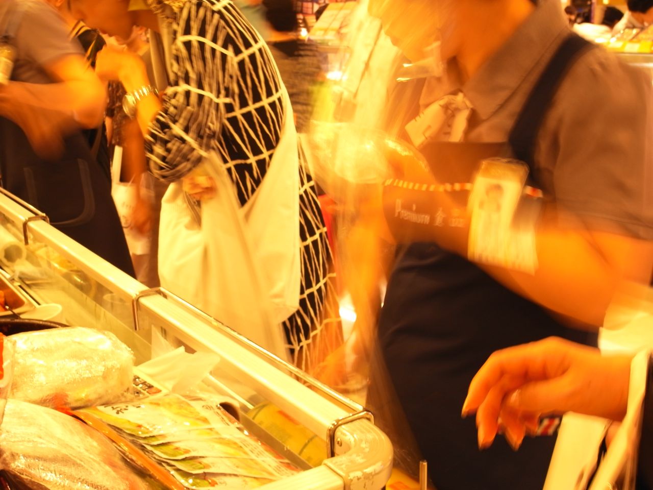 ロッテデパートのデパ地下キムチ売り場のおばちゃん。キムチを買うともの凄い勢いでラップをぐるぐる巻きにしてくれます。幾らシャッタースピード早くしても写らない。