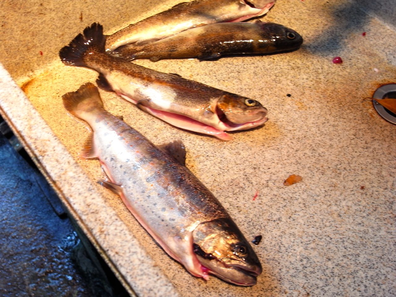 1時間のプランでは6匹までお持ち帰り可能、ということなのですが、さて「釣った魚はどうするのか?」。ここではコンロをレンタルして頂いて、その場で焼いて食べる事ができました。ちなみに、その場で食べて帰っても、お持ち帰りでも、釣った魚を持って行くと、スタッフのお兄さんがわた抜きをしてくれます。便利!