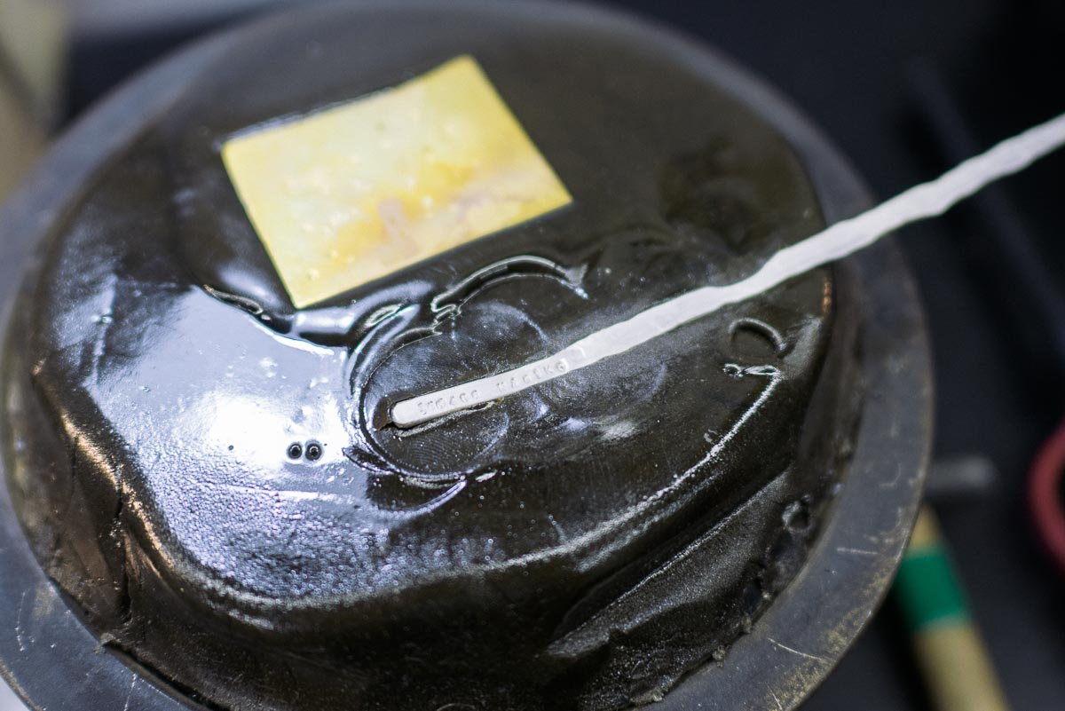 松脂でできている(!)という作業台を溶かして、先ほど作ったバングルの土台を固定。
