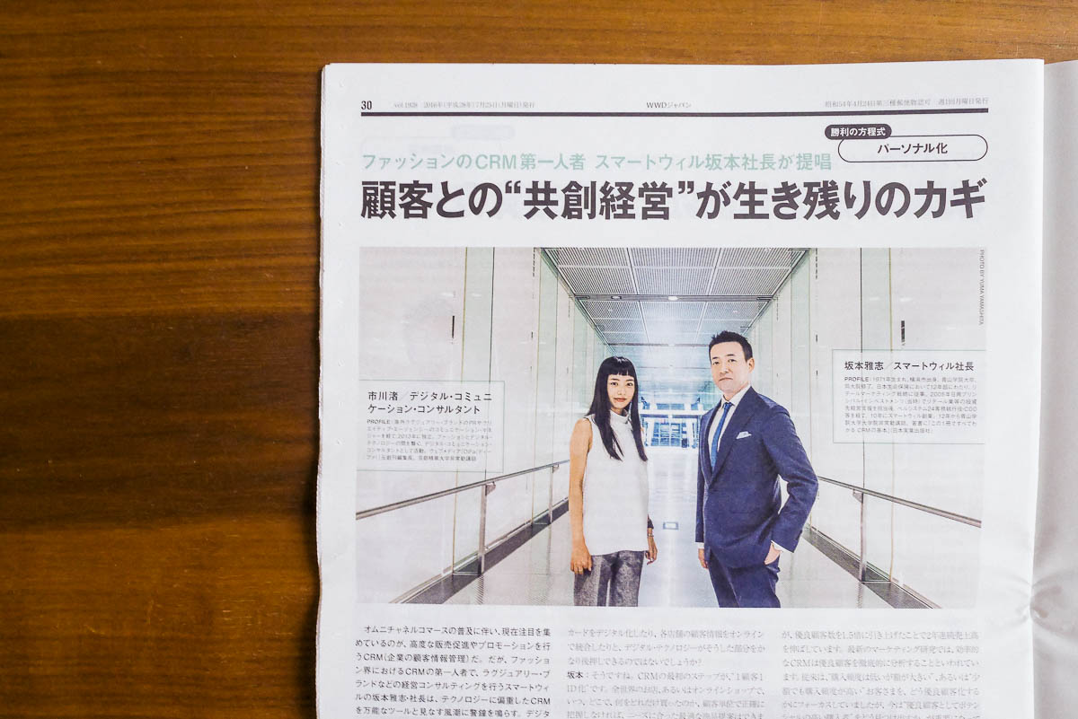 少しお時間が経ってしまったのですが……(汗)2016年7月25日号の「WWD ジャパン」ファッションEC特集号、CRMコンサルティング会社スマートウィル株式会社のタイアップ記事に登場させていただいています。スマートウィル社長の坂本さんと一緒に、これからのファッションビジネスに欠かせないCRMについて対談のようなかたちでお話をさせていただきました。